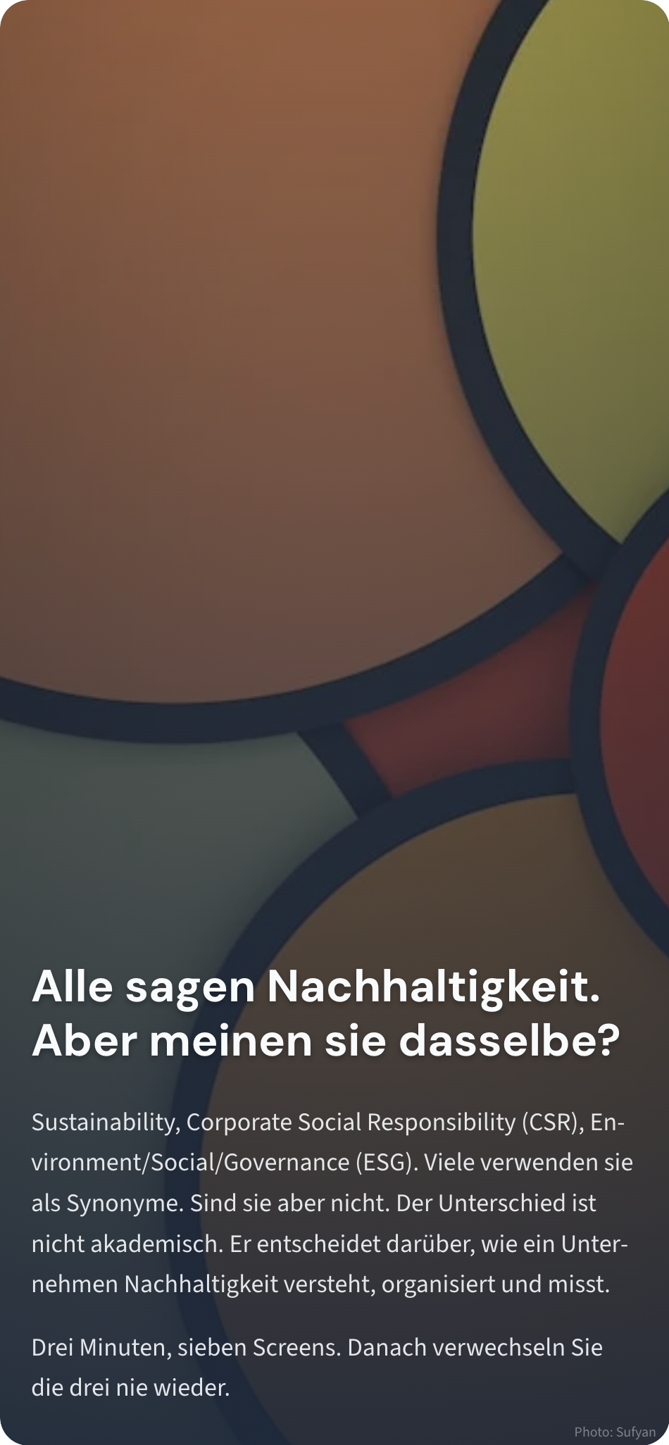 Sustainability, CSR und ESG. Drei Begriffe, die in jeder Vorstandspräsentation vorkommen. Die meisten verwenden sie als Synonyme. Aber sie beschreiben verschiedene Dinge, auf verschiedenen Ebenen, mit verschiedenen Zeithorizonten. Wer sie verwechselt, redet aneinander vorbei, ohne es zu merken.